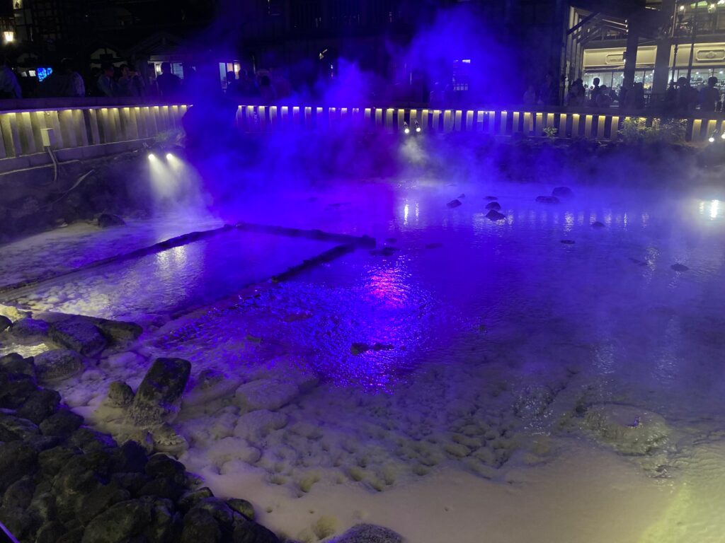 最後は草津温泉街における一番の観光地ともいえる湯畑です。湯畑とは温泉の成分である湯の華を採取や湯の温度を調節するため施設です。湯畑では常に温泉が湧きあがっているため、以下の写真のように、常に白い湯が立ち会あがり、温泉特有の卵のような匂いがしていています。草津の温泉は強い酸性が故、イデユユゴケが育つためきれいなエメラルドグリーンとなっています。また6時半以降はライトアップされ、赤、青、紫など様々な色に変わる湯畑が楽しめます。