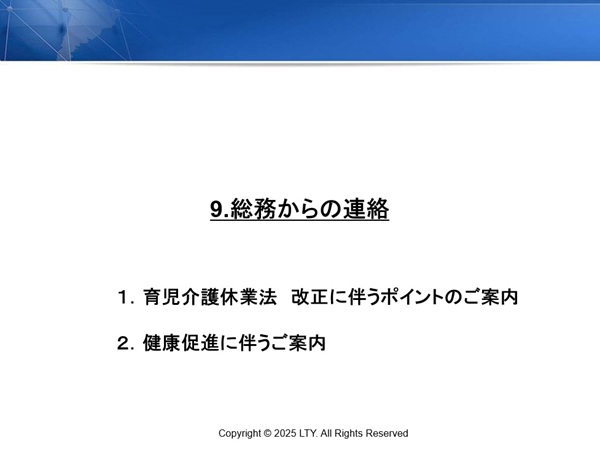 総務より『育児介護休業法』の改正に伴うポイントや健康促進に関する案内がありました。